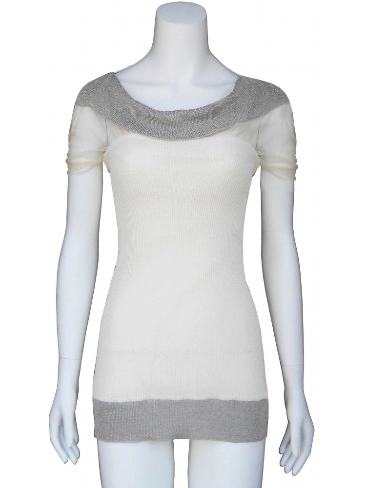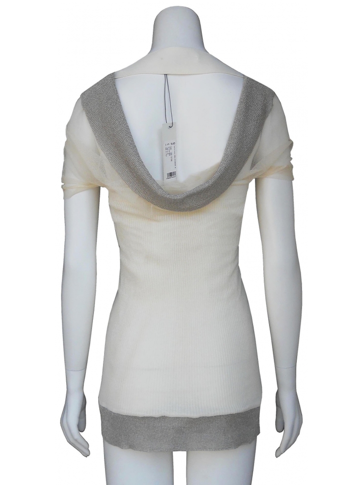 Shortsleeve stretch blouse with one internal layer of tulle covered by a strapless layer of ecru cotton fabric.Vibrant silver thread knitted on the bustline and hem.Scoop neckline on the back.