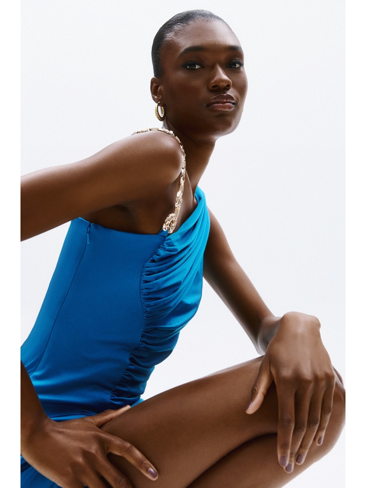 Tags: blue dress, turquoise dress, one shoulder maxi dress, evening gown, side slit, ruched dress, gold chain, formal dress, open back, elegant dress, allure dress
